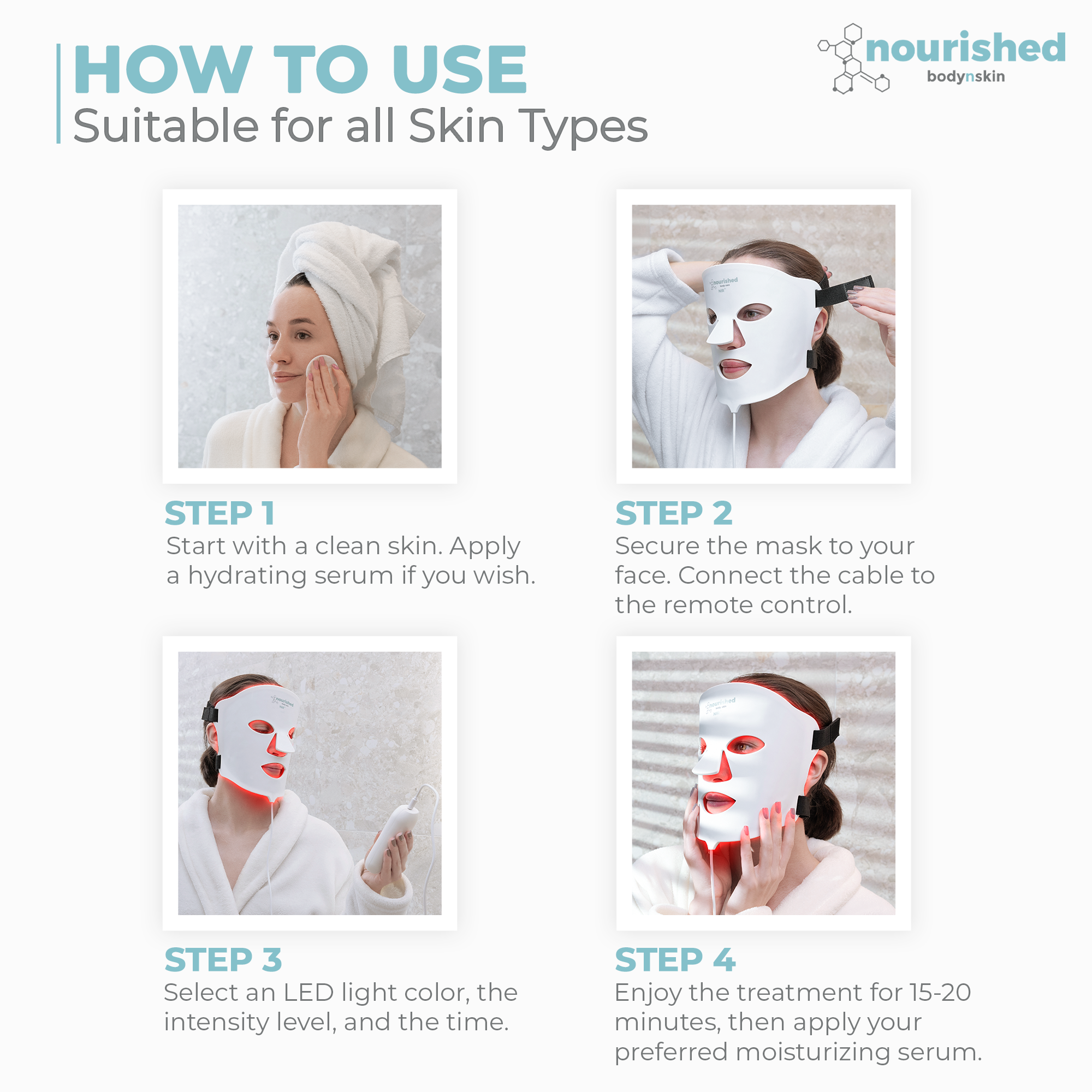 Our Nourished Bodynskin LED Face and Neck Masks are designed for wireless operation, meaning they do not need to be plugged into a stationary outlet during use. Instead, they are powered by a rechargeable remote control. To function, the masks must be connected to the remote control via a cord, which allows you to adjust the power, time limit, light color, and intensity settings. To charge the remote control, simply connect it to a USB power adaptor (5V 1A, for at least 3 to 4 hours) using the included USB-C to USB cable. Allow the remote control to charge until the battery is full, as indicated on the display. Please remember not to connect the Face or Neck Mask directly to a USB charger.